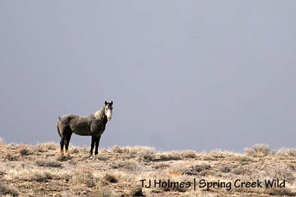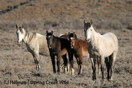 A bachelor since his gather (Aug. 21, 2007) and release (Sept. 19, 2007), as of at least March 9, he has ditched the bachelor boys and regained himself a mare and two foals (almost yearlings). I was in the basin Friday, March 7, and saw him in the evening with the Bachelor 7 (see post below for pictures). Sunday, March 9, I found him in the morning with Seven’s family: Houdini, Two Boots and Twister. (I believe Seven is Grey’s son.)