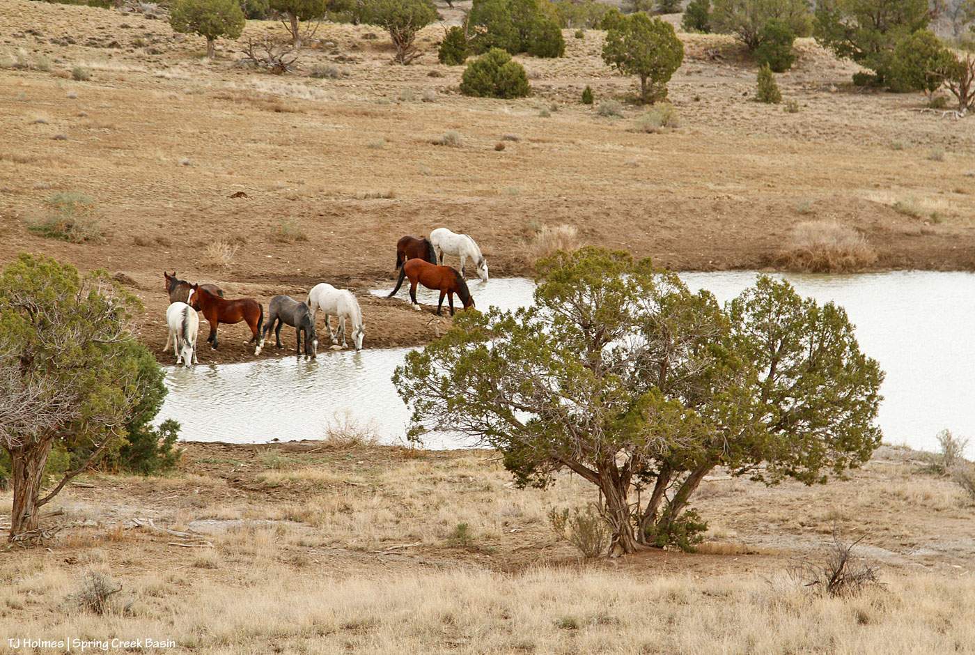 And then, as we were getting close to placing the last pipes, THIS happened: A couple of bands came down the hill from the northwest bowls (little “swales” in the northwestern part of Spring Creek Basin, above Spring Creek canyon) to drink at the pond in this area that I call the northwest valley. Why are we building a water catchment in an area that has a pond, you ask? Because, other than this year (of course), that pond only rarely has water in it, which meant that this area – usually dry – is a really GOOD location for a water catchment. And it has proved to be a good location – this year – for showing us that the horses will use this area – and graze it – when there’s water there to drink!