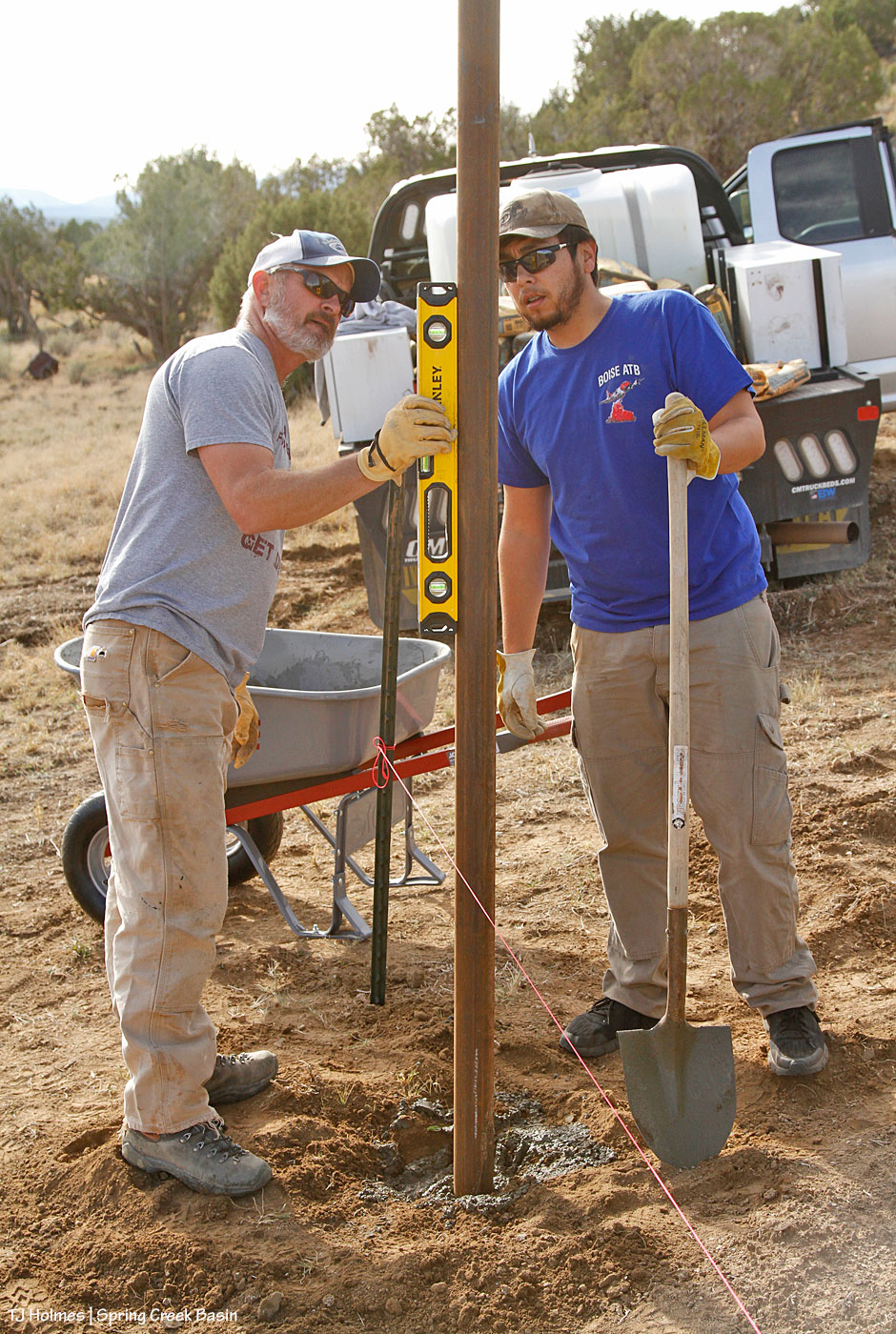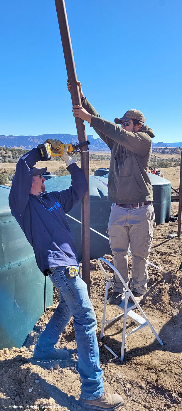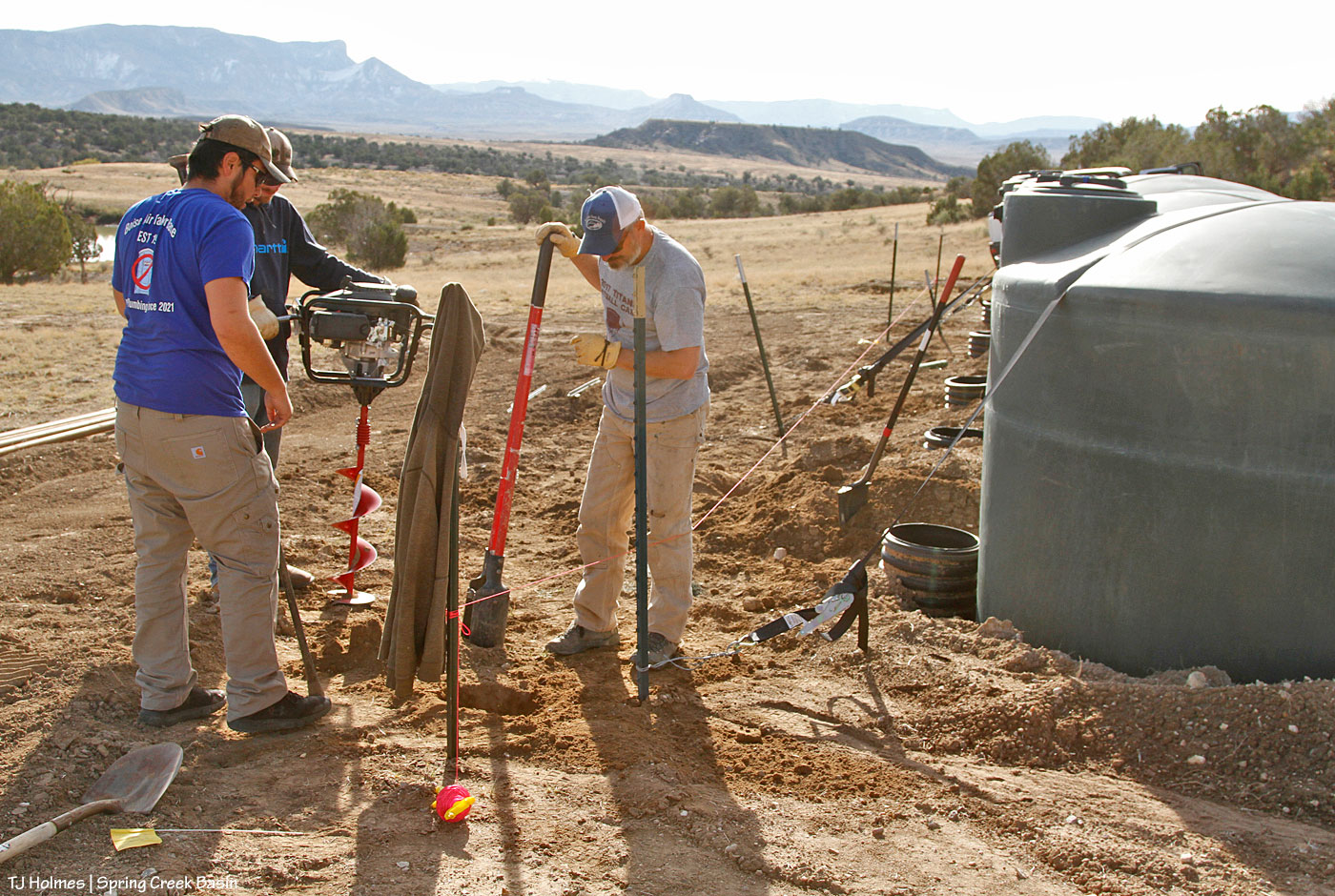 Getting close to end end of hole-auguring on the back side (uphill side) of the tanks. Of note: The white on the far ridges, including McKenna Peak and Temple Butte, IS, in fact, snow. That seems at odds with the guys wearing T-shirts, but it was warmish until the wind picked up. And did I note that it wasn’t HOT, and there were no gnats and no dust?