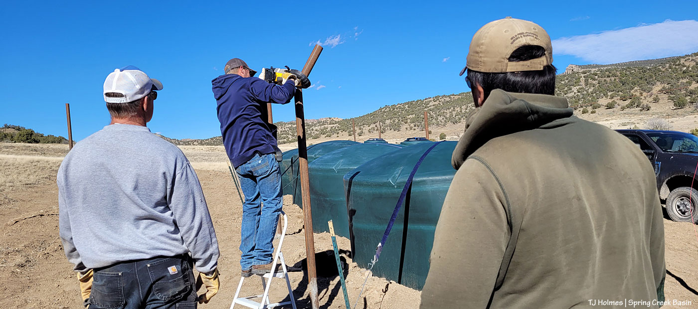 Last week, after waiting out the drying roads and before the next round of moisture (soaking rain and big, fat flakes of snow that didn’t stick but added to the moisture), Mike Jensen, Garth Nelson and Daniel Chavez – our BLM range heroes! – came out with tools and supplies, and we got started on phase 2 to get the catchment finalized to take advantage of hoped-for winter snow.