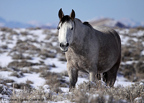 As much as I love the warm, rich colors of dun and sorrel and bay against the snow, I love the white-on-white of our spectacular greys. OK, she’s not “white,” being still fairly young (about 5 now? 6 next year), but I still love the more subtle contrast of her soft shade against the “soft” sage and shadscale and saltbush and snow.