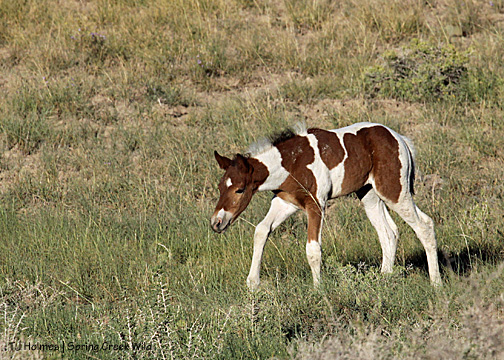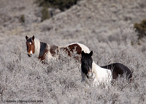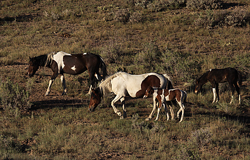 Left to right: Reya (4), Maiku (1), Puzzle (1) and Chipeta. They’re a long way from “home” territory. Chipeta is the dam of the foal that has now been adopted. We don’t know how they got separated. The helicopter pilot was excellent about not even targeting the horses we asked him not to. That’s why he left the bunch alone when he realized they were with the youngest foal. What a story that foal could tell … I’m not even sure who the horses were that were with Chipeta’s band when the pilot did see the group. So all the pintos (and their hangers-on) are accounted for except stallion Corazon.