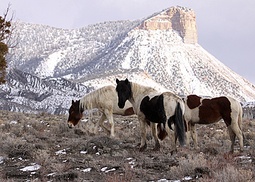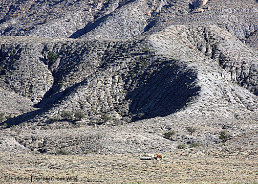 I hadn’t seen hide nor hair of the pintos, and I was just about to drop down into a drainage and walk out … when I spotted Corazon and Chipeta – way back near where I had first seen Copper. Of course. Their tracks – which I followed later – had come out of another drainage. So close … and yet so invisible.