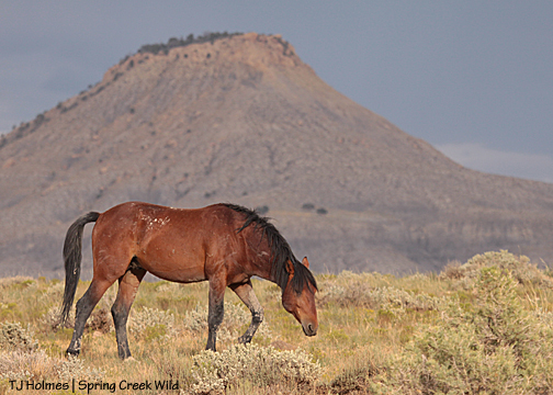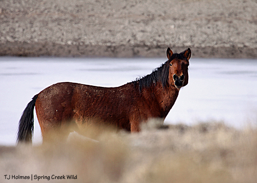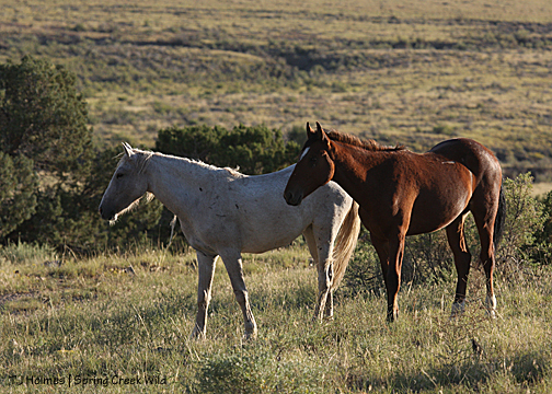 Tenaz and Corona. Tenaz was almost caught … Baylee was caught (she’s awaiting adoption – big, beautiful bay girl), and Storm gave observers a show when he galloped away right past them on the hill above the trapsite.