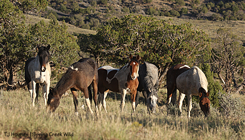 Family: Left to right: 2-year-old daughter of Kiowa, Spook; band stallion Copper, sire (likely) of Milagro and Maiku and Puzzle; Maiku, baby son of Kiowa; Kiowa, dam of Reya, Spook, Milagro and Maiku; Reya, 3-year-old daughter of Kiowa; and Milagro, yearling son of Kiowa and Copper, in the background. Milo’s ears are up, but he’s half-asleep, but how’s that for getting six pairs of ears up at the same time!