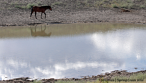 The last time I was out – also with Karen – I was driving along the herd area, marveling at the water running in arroyos, thinking “look at this water! I wish horses were here to take advantage …” – and shazam – there were Shadow and Wind and David!
