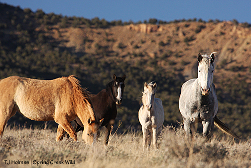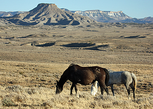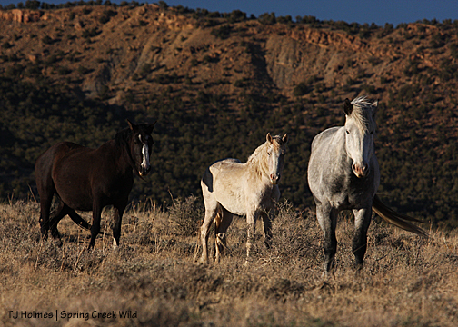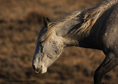 The day before the roundup actually got under way, we were setting up at the new trapsite, and I think we were all amazed when Kreacher’s band went racing across the hill to the west – with Sundance immediately behind them, Chrome behind him and Kreacher trailing. Sundance had been a mostly lone bachelor since losing Mahogany and Eliana to Aspen this spring right after Eli was born. I had to go for my binoculars to confirm what my eyes were telling me. Then they were over the hill, out of sight, and there was Chrome’s band.