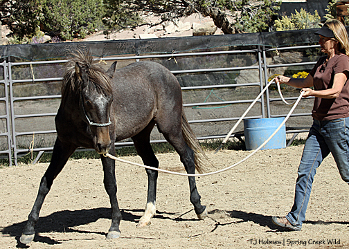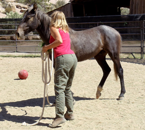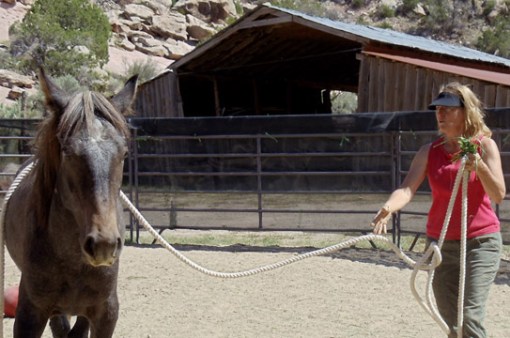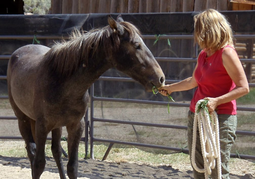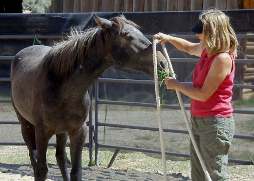 * Pati and David have adopted several mustangs over many years (including those they’re riding in the photo of the plaque above). In 2011, they adopted yearling Rio (Grey/Traveler or Twister x Two Boots) and renamed him Sherwood, in honor of one of the founding members of NMA/CO. Pati is a genius at groundwork, and at 2 years old, Sherwood loads readily into a trailer and accepts a cinched saddle, among other things.