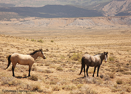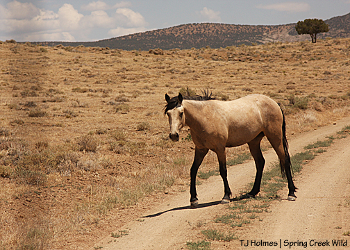 For a couple of weeks at least, I’ve had photos of Chrome’s band, hoping to have time to tweak and share. They’re usually visible very soon after entering Spring Creek Basin, and many visitors recently are familiar with them. The only pic I think I’ve managed to post is the one of Winona peeking around the tree. But a recent comment asking about Terra’s pregnancy status decided me that I’d better get some pix of these photogenic ponies posted!