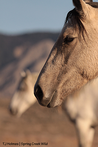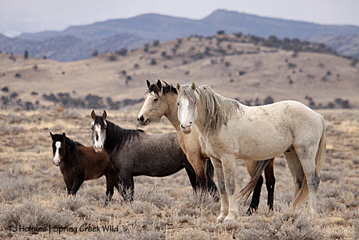 When I first saw those two dots, they were three dots: two grey, one dark (bay): Chrome and Kreacher and Duke. And yes, they’re really about as far away as they appear, so Chrome had left his girls and his boy to have a little man-to-man-to-man chat. I parked not far away and walked out on a trail, and I was sitting on said trail at the moment I pressed the shutter on this shot. I reached his girls and boy before he did.