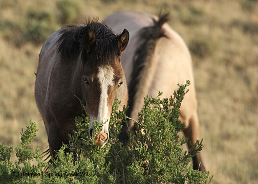 Kwana, 9 months old, still has blue eyes. Here, he’s feasting on scrumptious greasewood with “auntie” Winona behind him. Even with grass all around, they do love the greasewood.